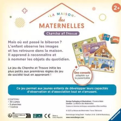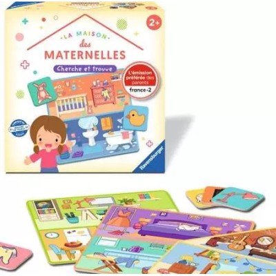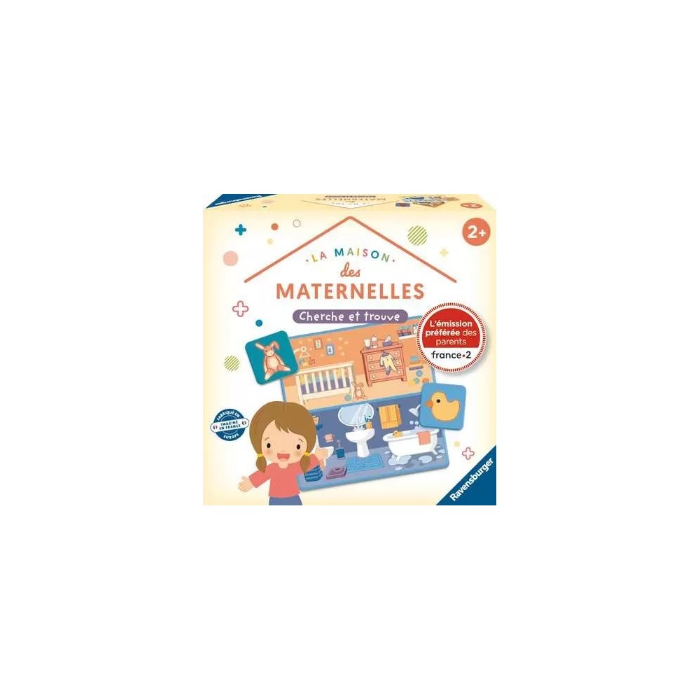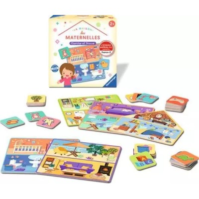 Un grand classique dans le doux univers de la Maison des Maternelles ! L'enfant recherche dans quelle pièce de la maison se trouve son image et développe ainsi sa capacité d'observation et d'association. Le jeu du Cherche et Trouve permet d'initier tout en douceur les plus jeunes aux jeux de société. Il suffit de quelques secondes seulement pour se familiariser avec la totalité des règles.