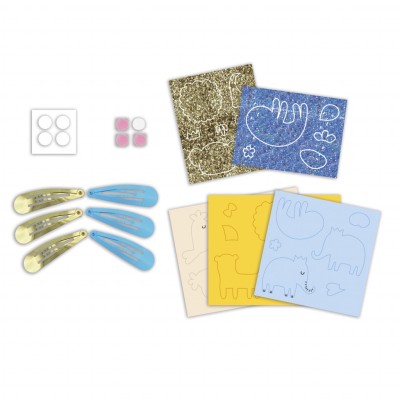 Ce coffret contient : 6 barrettes de 5 cm, 3 planches de feutrine prédécoupée et autocollante, 2 planches de matière pailletée prédécoupée et autocollante, 4 pompons, des pastilles autocollantes double-face. Pas besoin de colle ! Un livret est aussi inclus, avec toutes les instructions et les modèles à reproduire avec le contenu du kit.