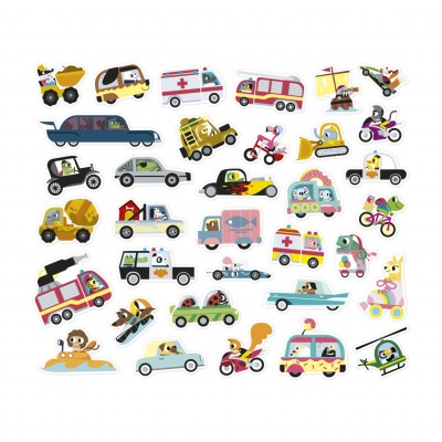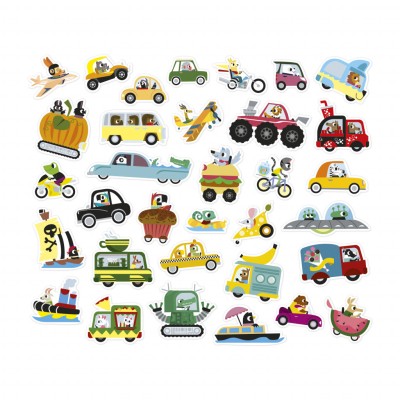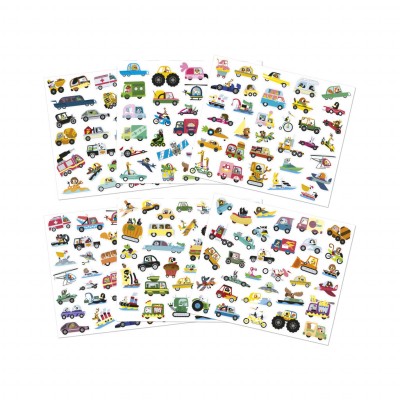 6 planches d’autocollants sur la thématique des transports : tout ce qui roule, mais pas seulement : retrouvez des bateaux ou des pilotes.