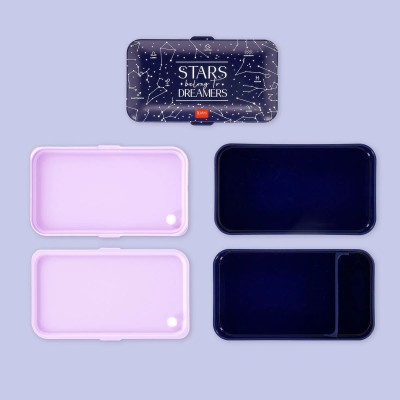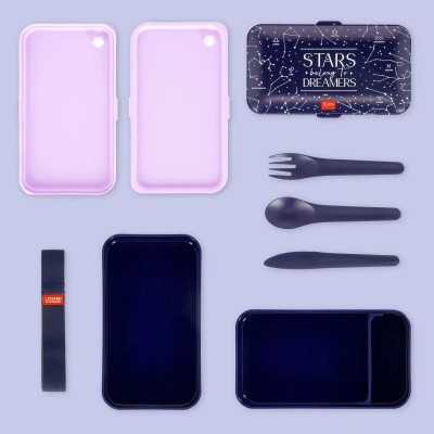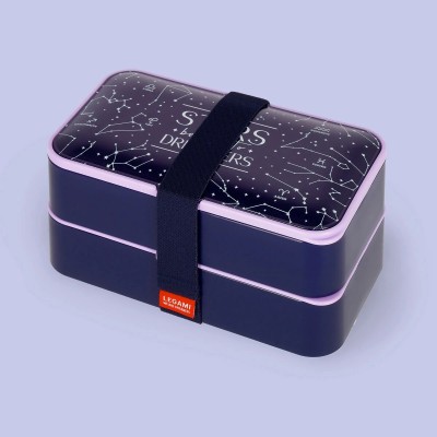 Boîte Repas sur le thème du Zodiaque de Legami. Avec des plateaux empilables, amovibles et aussi utilisables séparément, ainsi que 3 couverts inclus. Capacité d’1,2 litres. Compatible lave-vaisselle et micro-ondes. Boîte à repas de type Bento Box.