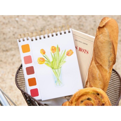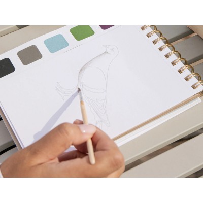 Tout est prêt : pas besoin de tubes, ni de palette séparée. Vous trouverez à l’intérieur 50 teintes d’aquarelle directement intégrées, un pinceau fin et facile à prendre en main, et une vidéo de cours d’aquarelle d'une heure pour vous guider pas à pas. Idéal pour les débutants ou les curieux qui veulent se lancer sans pression, à leur rythme.