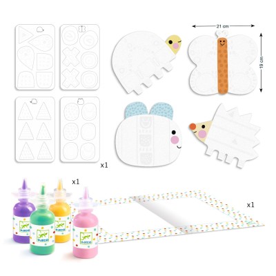 4 planches silhouettées à peindre, 4 planches de petites formes autocollantes à dépuncher et à peindre, 4 bouteilles de peinture à doigts, 1 protection de table en papier et un livret explicatif visuel.