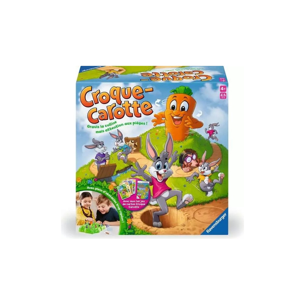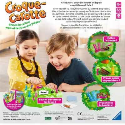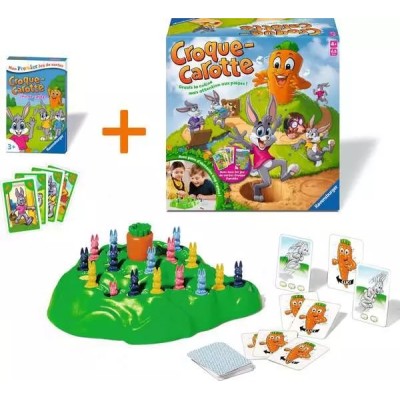 Deux jeux en un coffret ! Découvrez le mythique Croque Carotte avec son parcours semé d'embûches plus un jeu de 7 familles exclusif. Dans la course classique, menez vos lapins vers la carotte au sommet en évitant trous, taupe coquine, pont-levis et clôture.