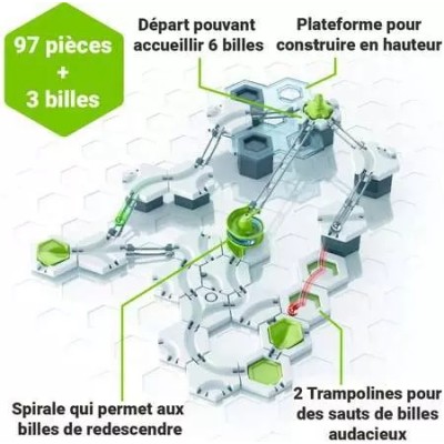 Le coffret GraviTrax Action Set Twist contient 101 pièces au total dont 2 éléments spéculaires inclus : le trampoline et la spirale !