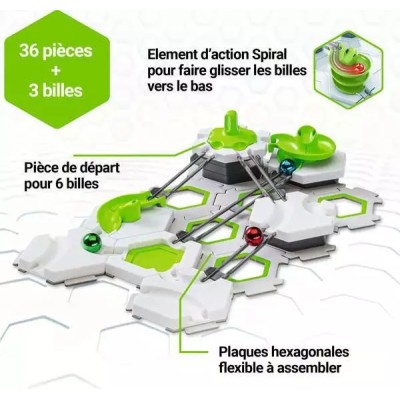 Ce set comprend 36 pièces 3 billes et un livret avec des plans de montage selon les niveaux de difficulté facile", "moyen" et "difficile". Il s'agit d'une introduction ludique et créative à l'univers GraviTrax