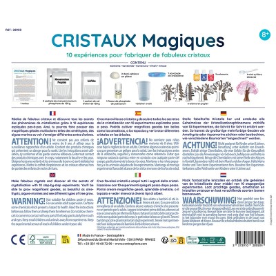 ATTENTION ! Ne convient pas aux enfants de moins de 8 ans. A utiliser sous la surveillance rapprochée d'un adulte. Contient des produits chimiques qui présentent un danger pour la santé. Lire les instructions avant utilisation, s'y conformer et les garder comme référence. Eviter tout contact des produits chimiques avec le corps, notamment la bouche et les yeux. Eloigner les jeunes enfants et les animaux de la zone où sont réalisées les expériences. Mettre le coffret d'expériences hors de portée des enfants de moins de 8 ans.