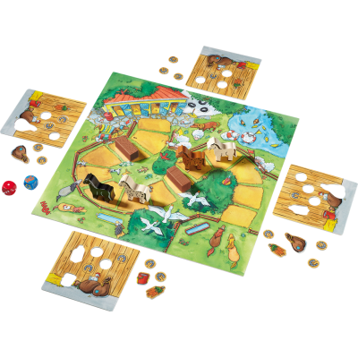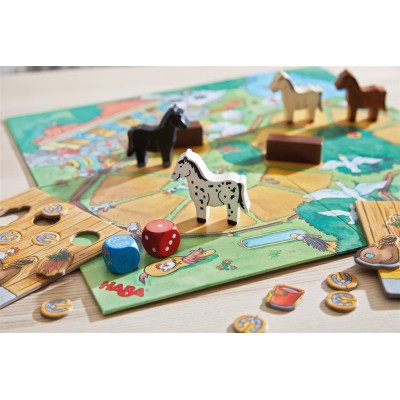 Les chevaux ont passé une belle journée dans le pré, mais ils doivent vite rentrer à la ferme. Dans leur box, il leur faut différentes coses, comme une botte de carottes et un sac d'avoine. C'està vous de les récuperer sur votre chemin menant à l'écurie. Celui qui choisira les bons dés en route et aura un peu de chance emmènera en premier son cheval au box.