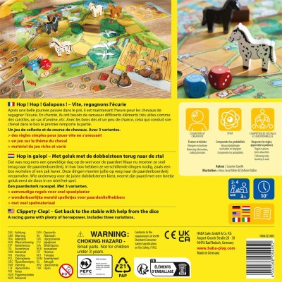 Contient : A plateau de jeun 4 chevaux en bois, 4 plateaux de 7 pièces de puzzles, 2 dés, 2 obstacleset la règles du jeu.