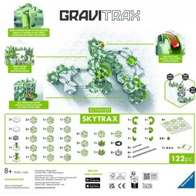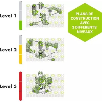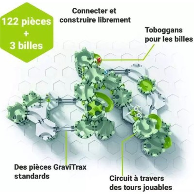 Ce set comprend 120 pièces 3 billes et un livret avec des plans de montage selon les niveaux de difficulté facile", "moyen" et "difficile". Il s'agit d'une introduction ludique et créative à l'univers GraviTrax
