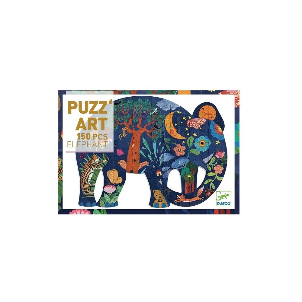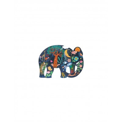 Un format inédit et une façon ludique et originale de réaliser un puzzle avec une grande silhouette d'éléphant ajourée dans lequel de nombreuses illustrations sont représentées.